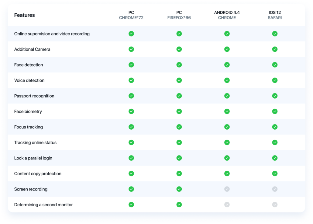 Candidates are monitored via web camera during the whole test-taking process. All their screen activities are recorded, and any suspicious behavior is flagged using behavioral trackers. Artificial intelligence technology marks moments when there are multiple or unauthorized faces in front of the camera, background noise, changing focus to another window, and many more. If there is a violation, the system will automatically lock the screen to prevent unauthorized access. After the exam is over, the system generates the credibility report, i.e., proctoring report containing the score and assessment of candidates' behavior.