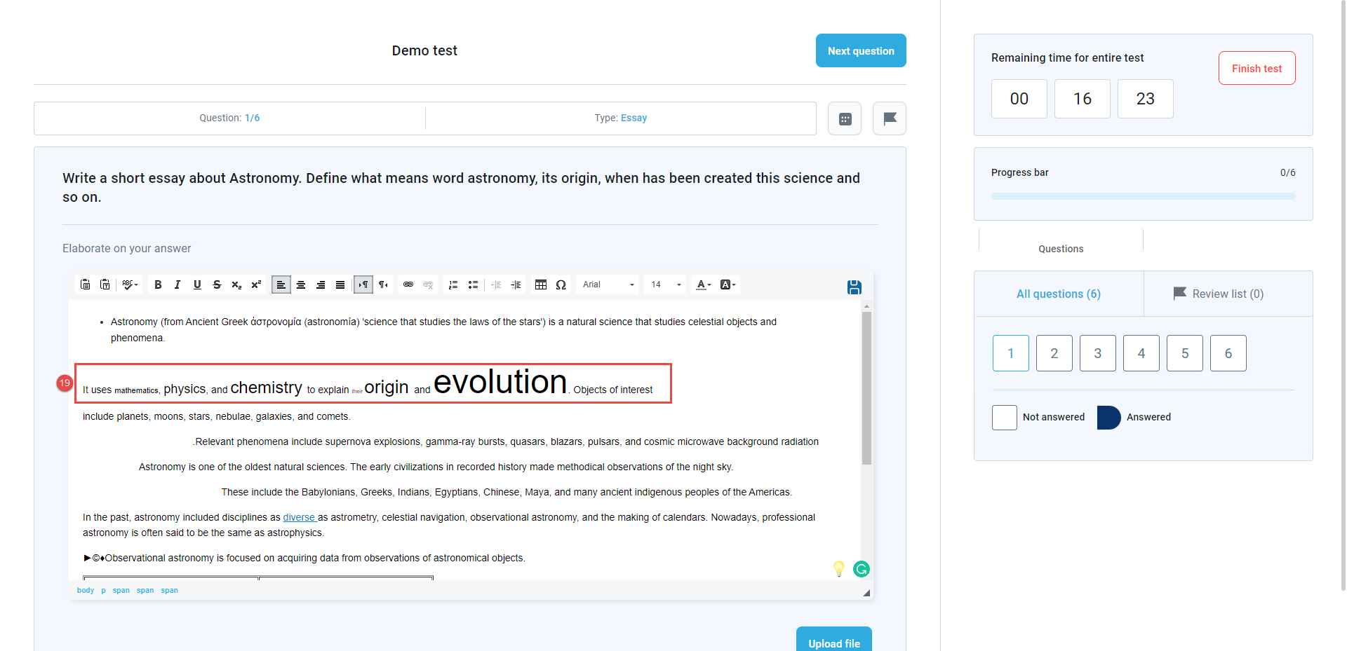 This article explains the two ways of adding an answer to the essay question. The candidate can enter the answer directly into the text field or upload a file.