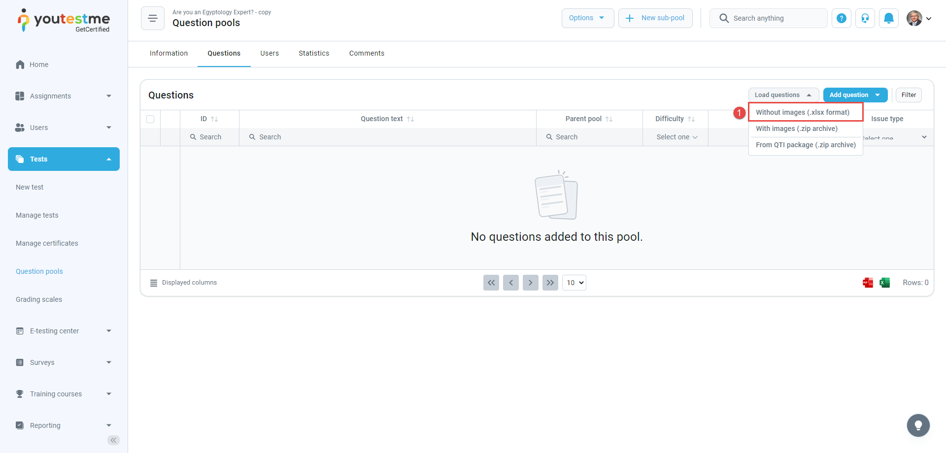 To access the Question pools page, click the Tests tab in the left-side menu and select Question pools.