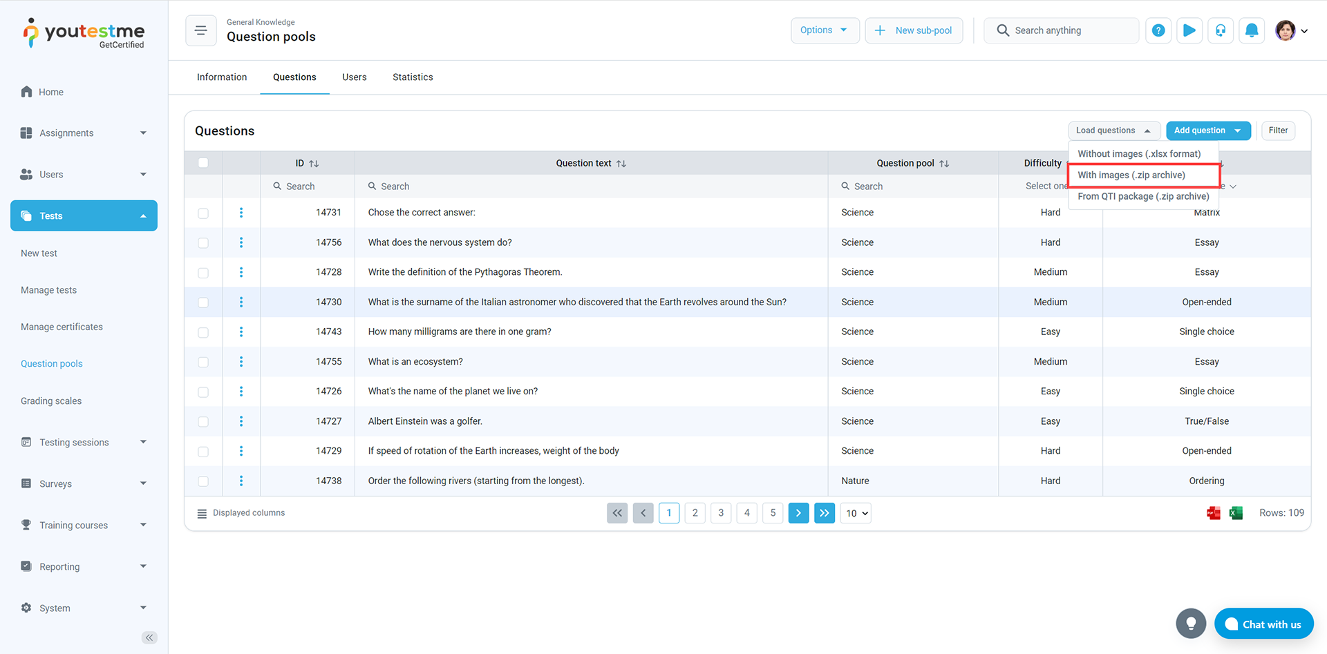 - Click the “Load questions” button, and select the option “With images.”