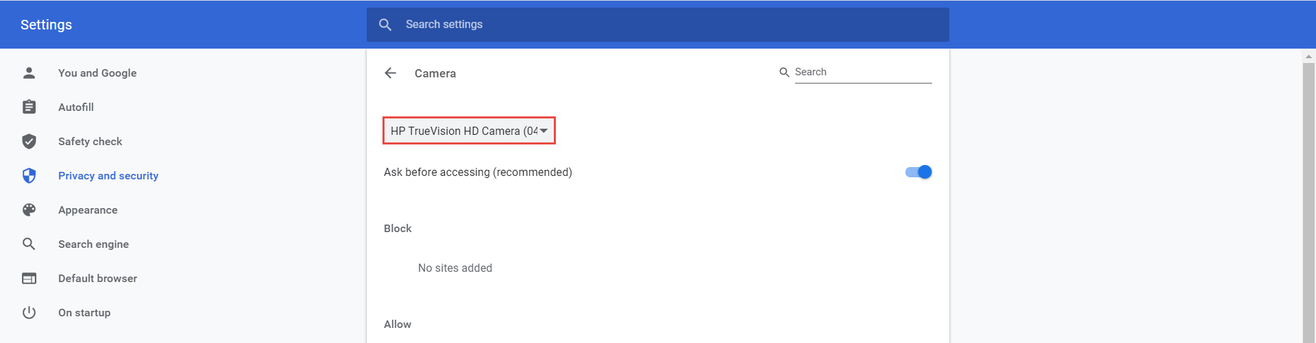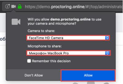 When starting a proctored test, you need to allow using a camera and microphone. Before you allow to use them, you can choose the desired one from several in the dropdown menu.