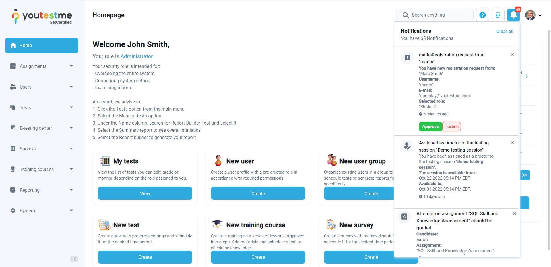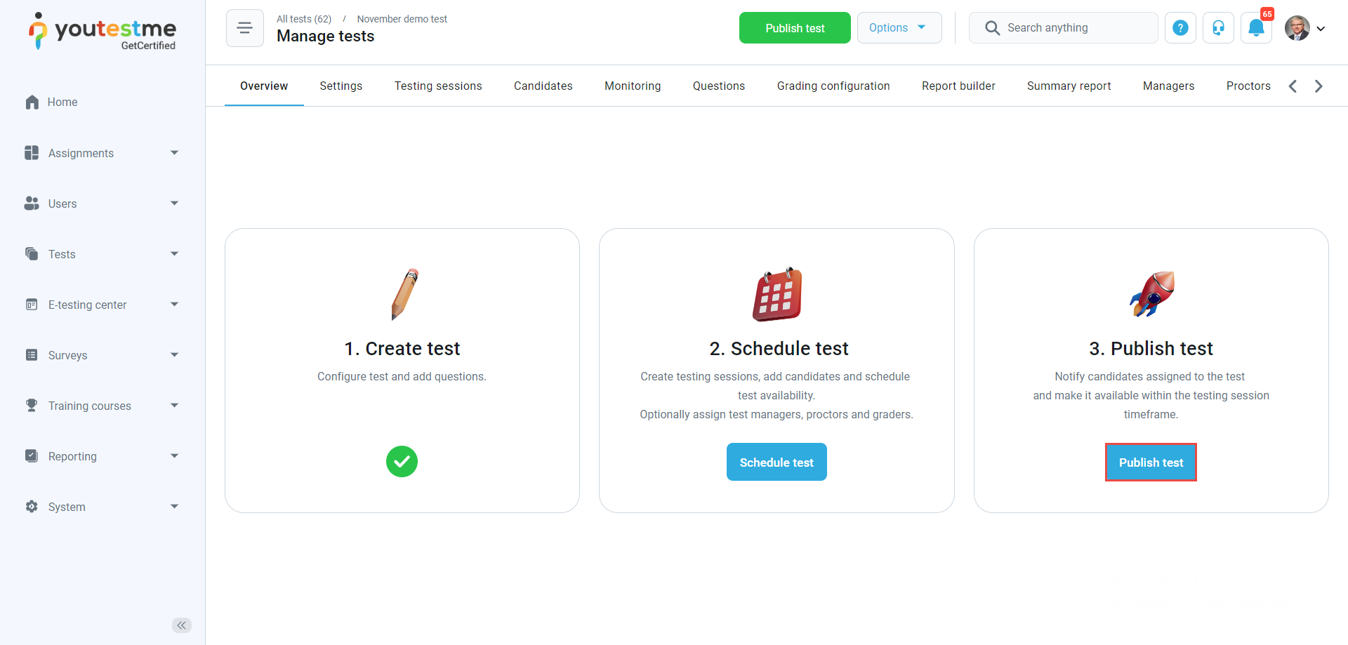 - Test published – The notification triggers when the instructor completes the test creation process, creates the testing session and clicks the Publish test button to make the test visible to the candidates. When the test manager assigns you to the testing session, you will receive an email and in-app notification containing the test details.