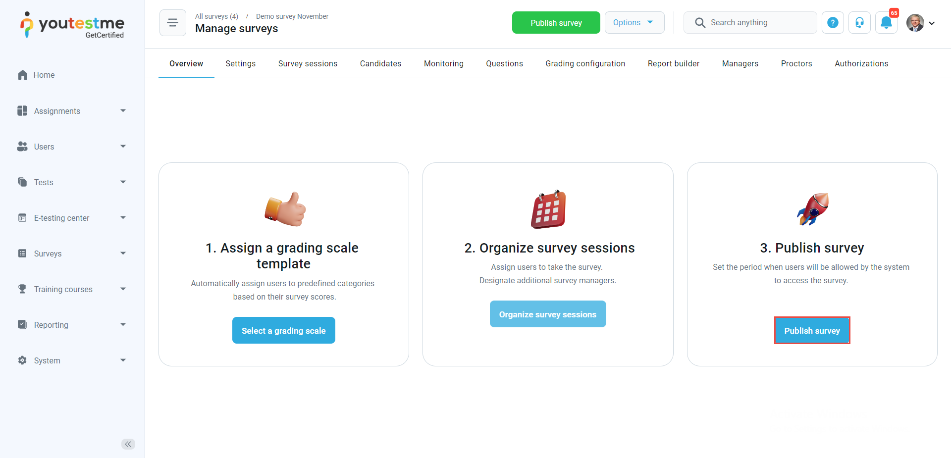 - A survey published – The notification triggers when the instructor completes the survey creation process creates the survey session and clicks the Publish survey button to make the survey visible to the candidates. When the survey manager assigns you to the survey session, you will receive an email and in-app notification containing the survey details.