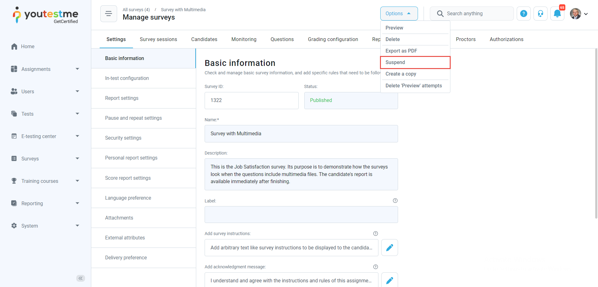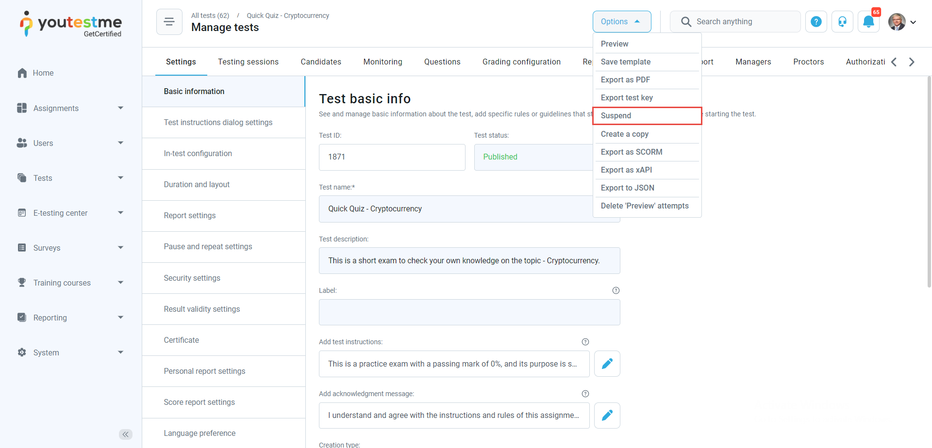 - Test suspended – The notification triggers when the test manager visits the Tests/Manage tests page, selects the test, and by choosing the Suspend option, suspends the test. After it, the user assigned to a currently active test session will receive an email and in-app notification containing the message that the test has been suspended.