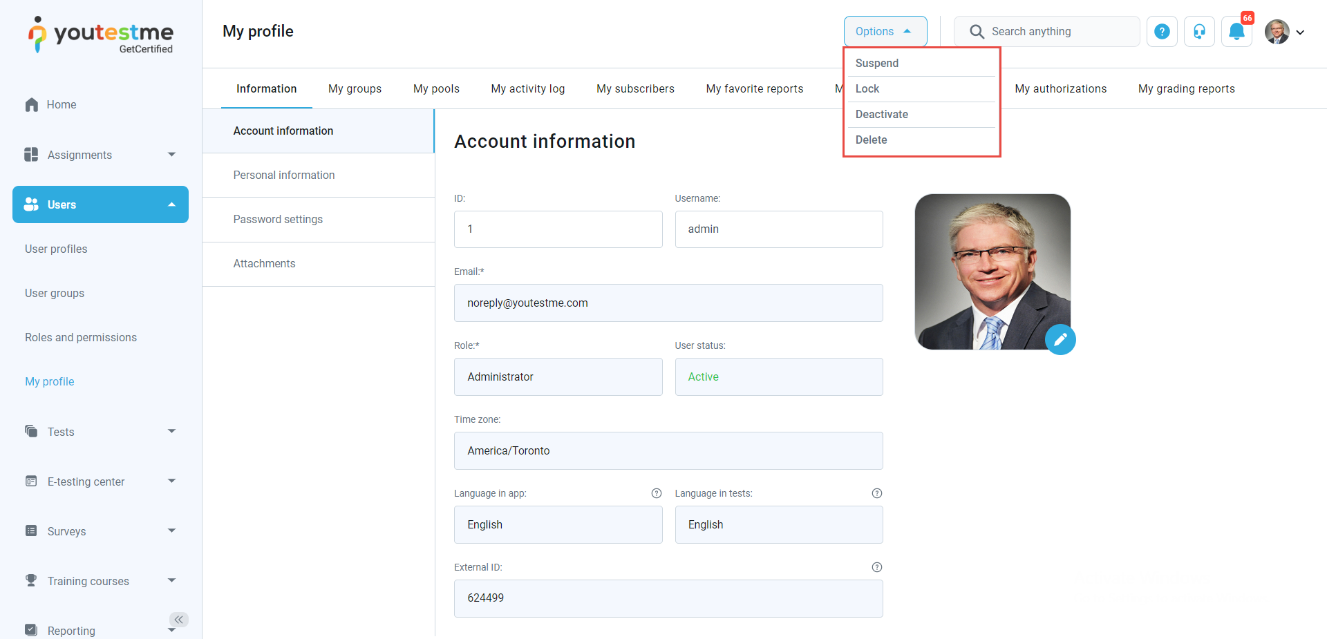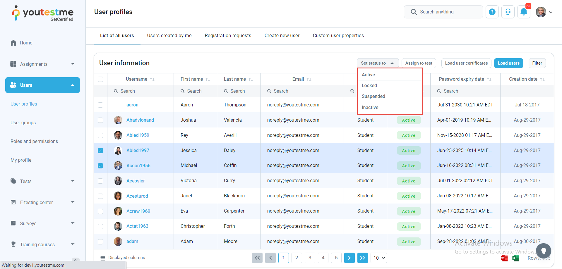 - User’s status changed – The notification triggers when you select one user in the system and change their status in the application to Suspended, Locked, Deactivated, or Deleted. The user will receive an email notification that their status has been changed to any of the mentioned statuses.