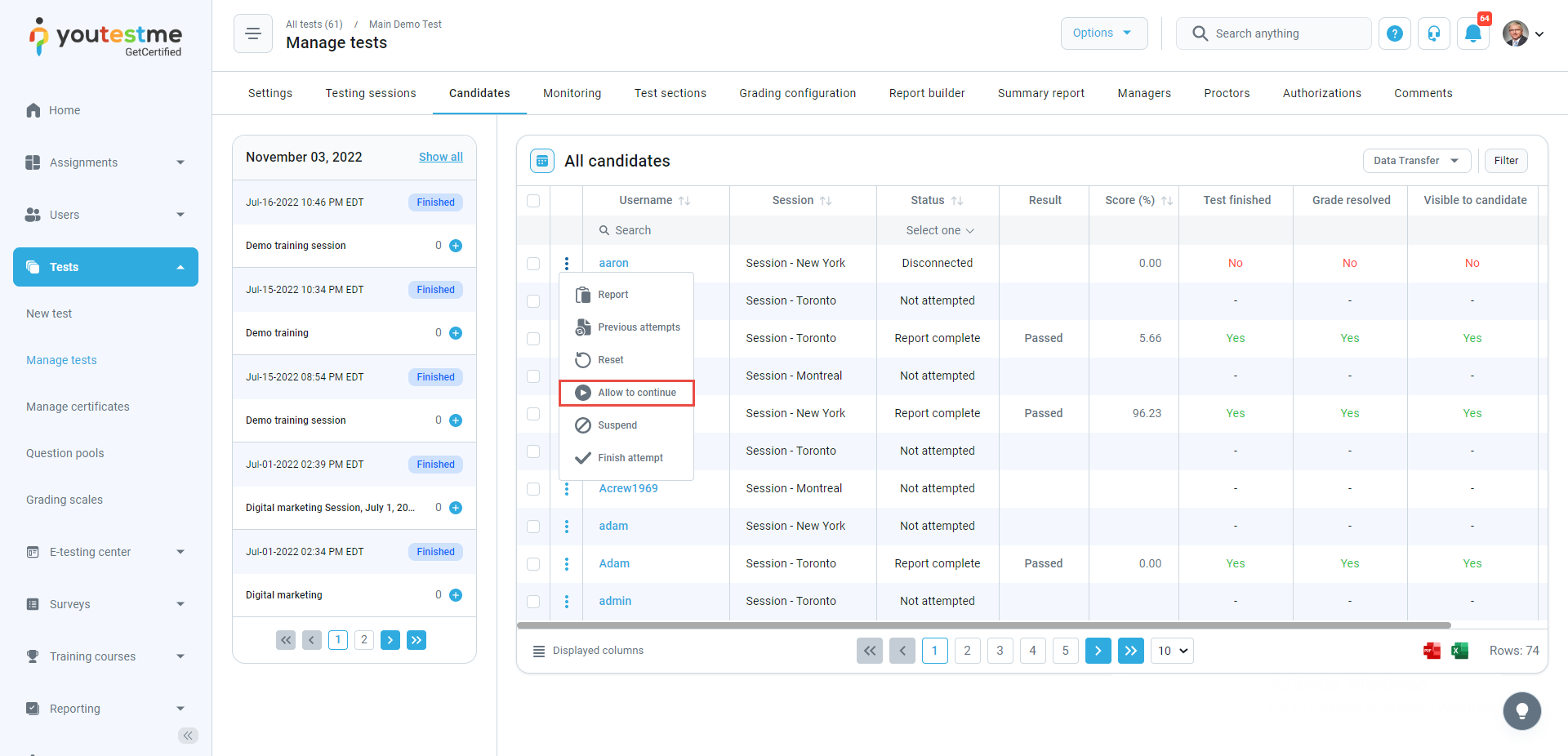- Allowed test/survey continuation – The notification triggers when the user suddenly leaves the test or survey before completing it. The test or survey manager needs to navigate to the test/survey settings, then to the Candidates tab, and allow the candidate to continue the test or survey attempt. After the manager allows the continuation, an email and in-app notification will be sent to the candidate.