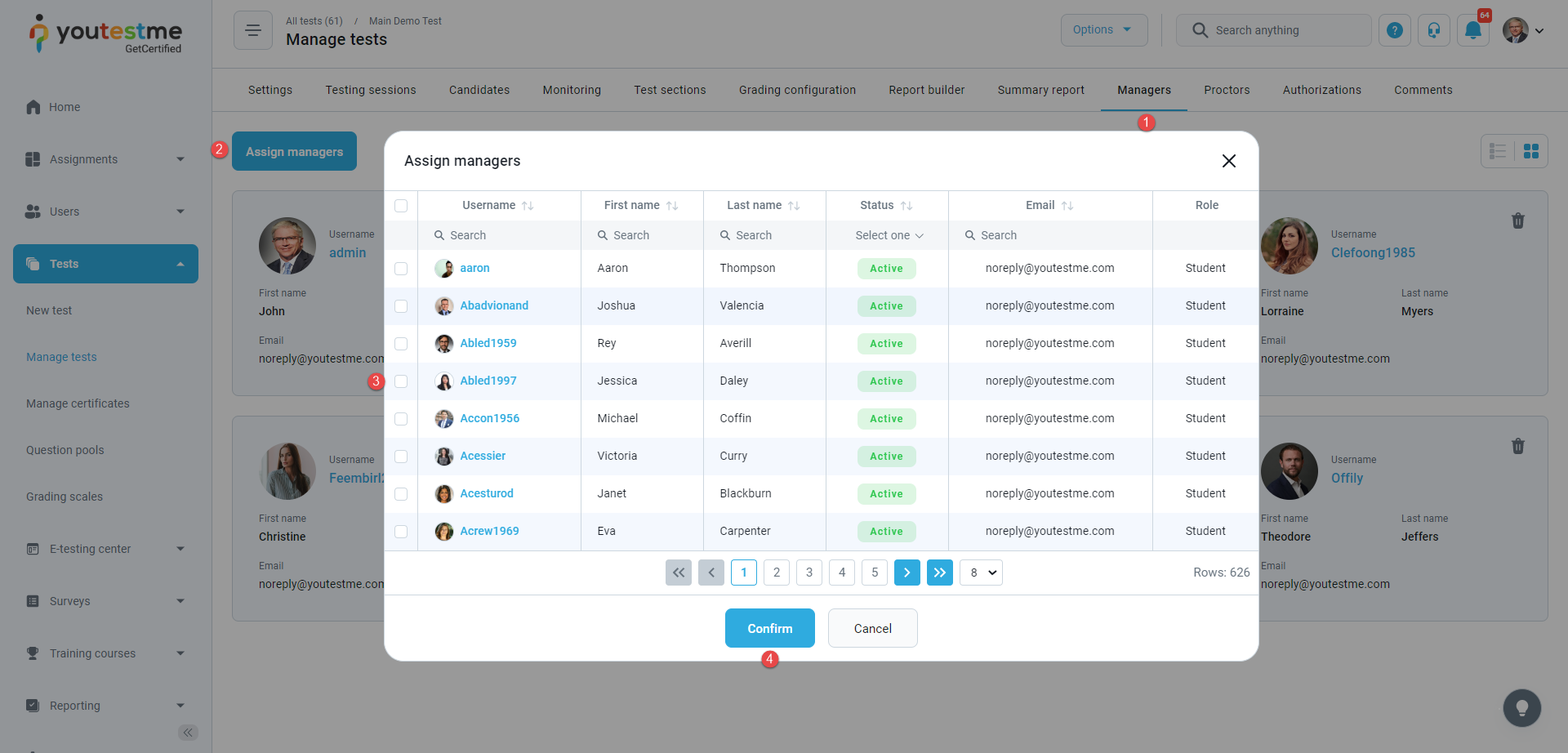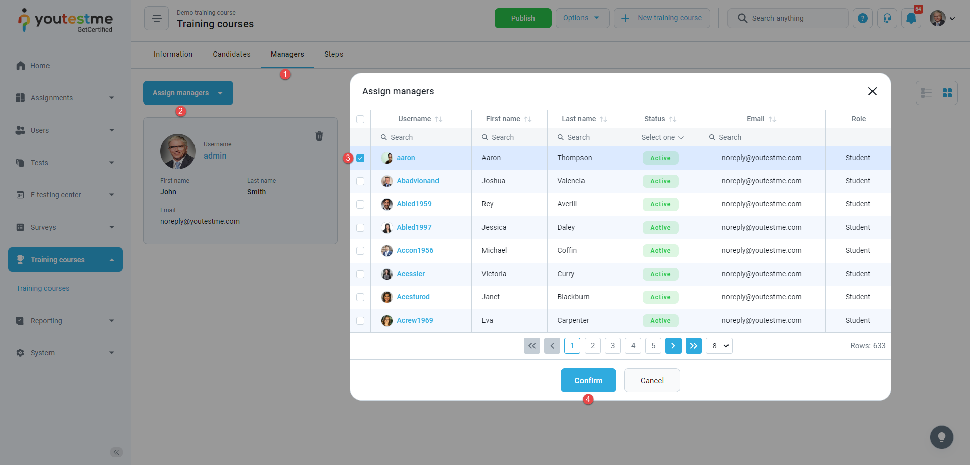 - Assigned as a training course manager – The notification triggers when you are assigned as a manager of a training course. Visit the Training courses page, select the training, move to the Managers tab, the Assign managers tab, select user(s) from the list, and click the Confirm button. After the action is performed, the user is assigned as a training course manager, and they will receive an email and in-app notification with the details of the training course you manage.