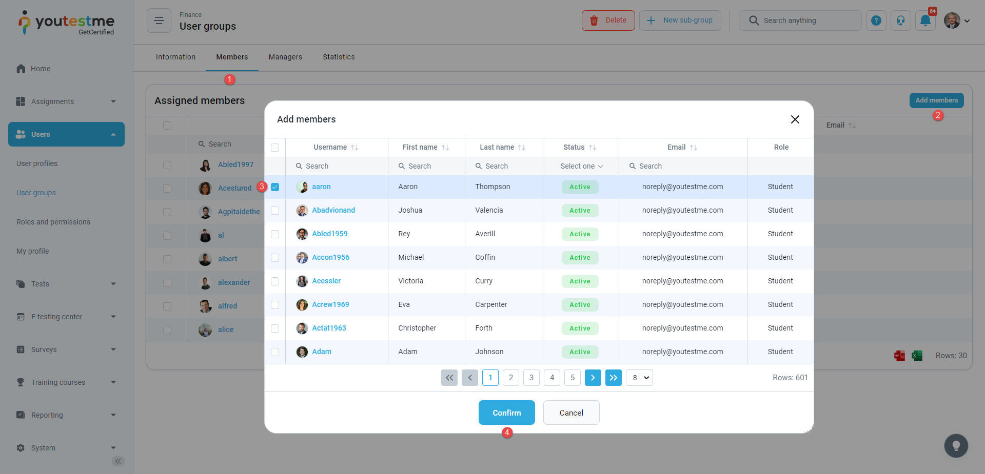 - Assigned as a group user – The notification triggers when you are assigned to a particular user group. Navigate to the group, and in the Members tab, click the Add members button, select the user you will assign as a group member, and click the Confirm button. After the action is completed, the user is assigned as a group member, and he will receive the email and application notification with the group name.