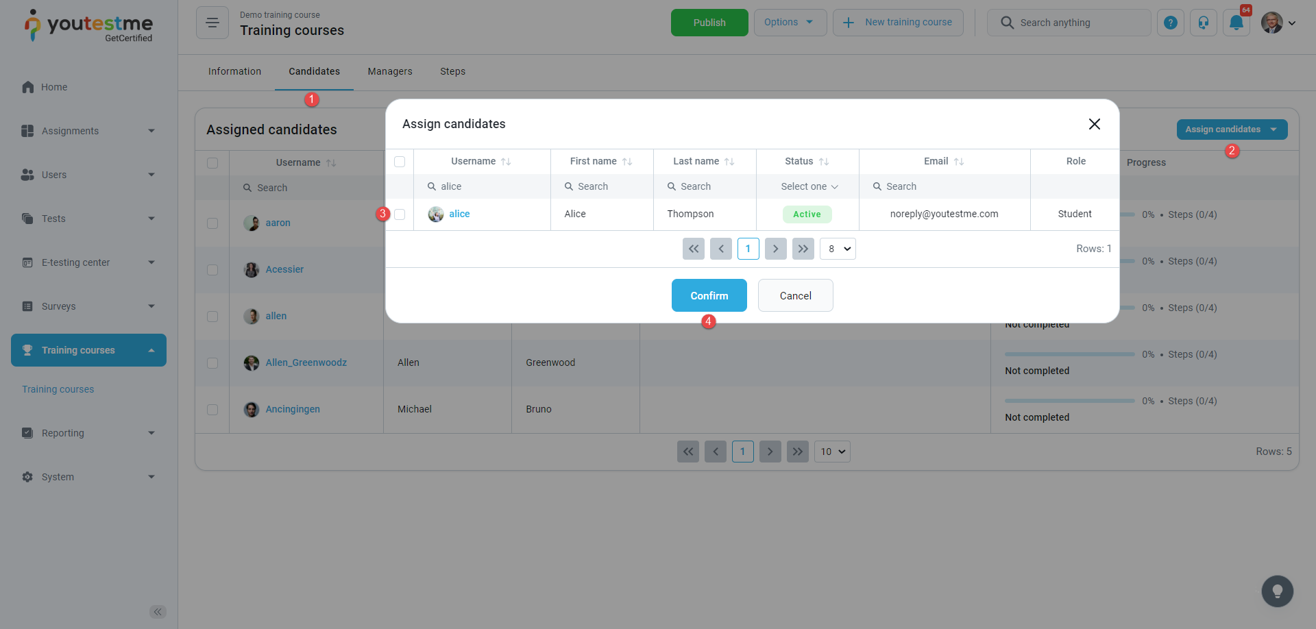 - Assigned as a training course user – The notification triggers when you Training courses page, select the training, move to the Candidates tab, select user(s) from the list, and click the Confirm button. After the action is performed, you are assigned as a training course user. You will receive an email and in-app notification with the training course details.