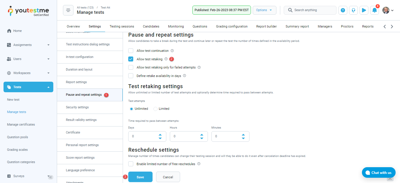 - Allow users to retake the test an unlimited number of times (“Unlimited”), or limit the number of test-retake attempts (“Limited”).