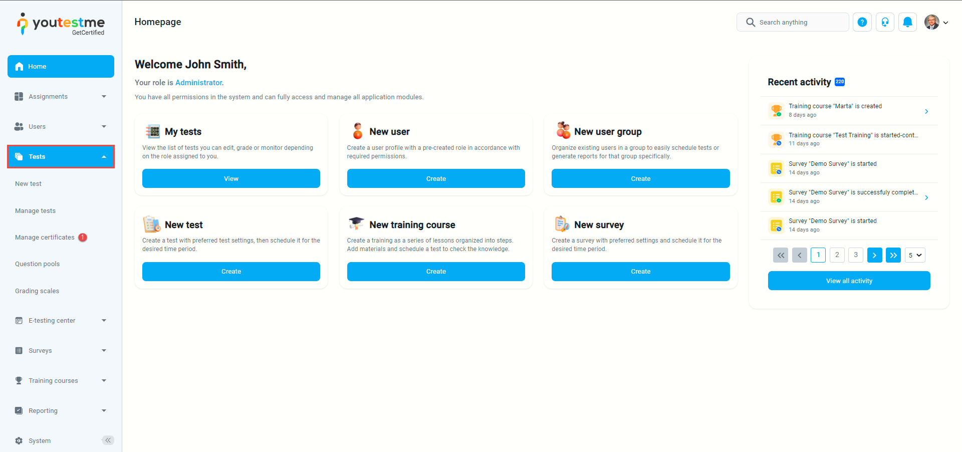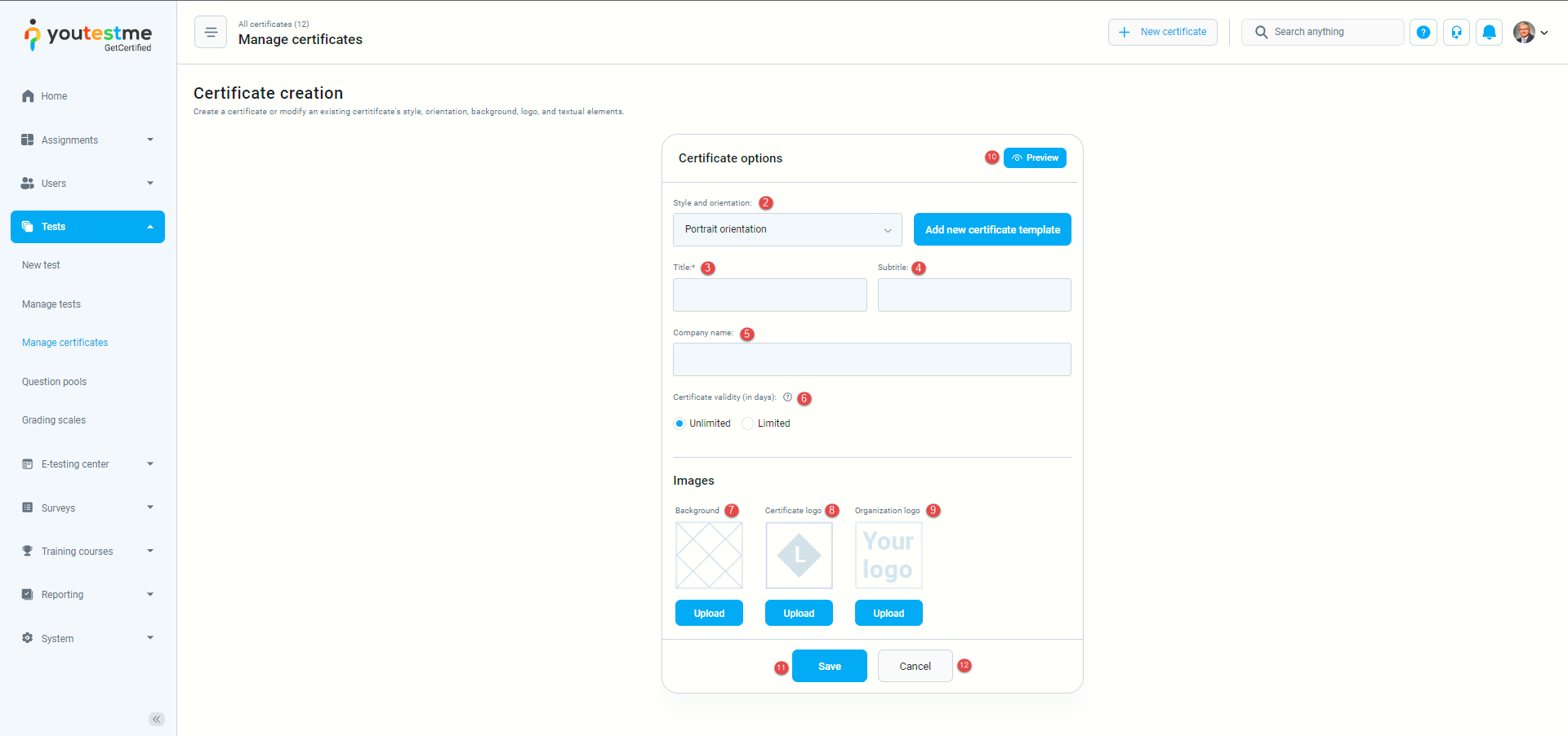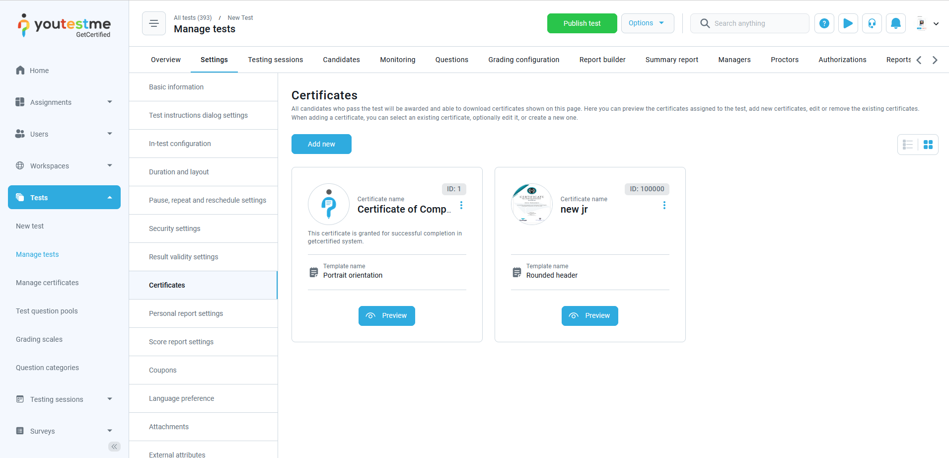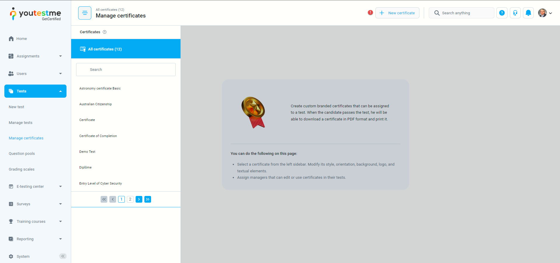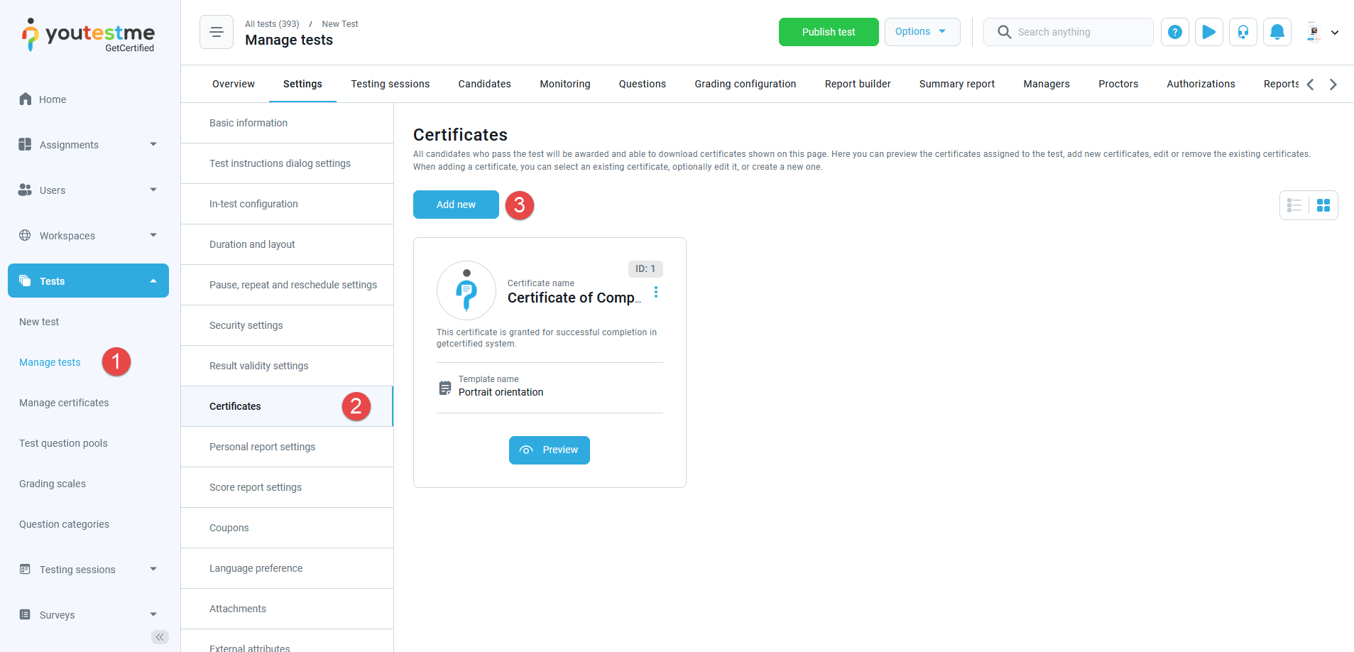 To access the managing certificate page, click “Tests” in the main menu, and select “Manage certificates.”