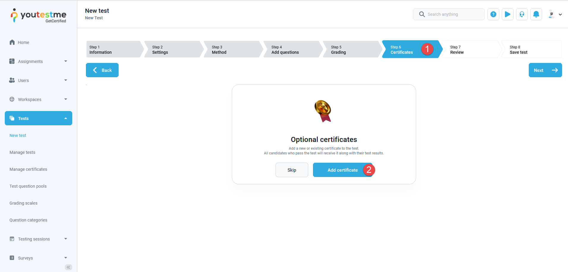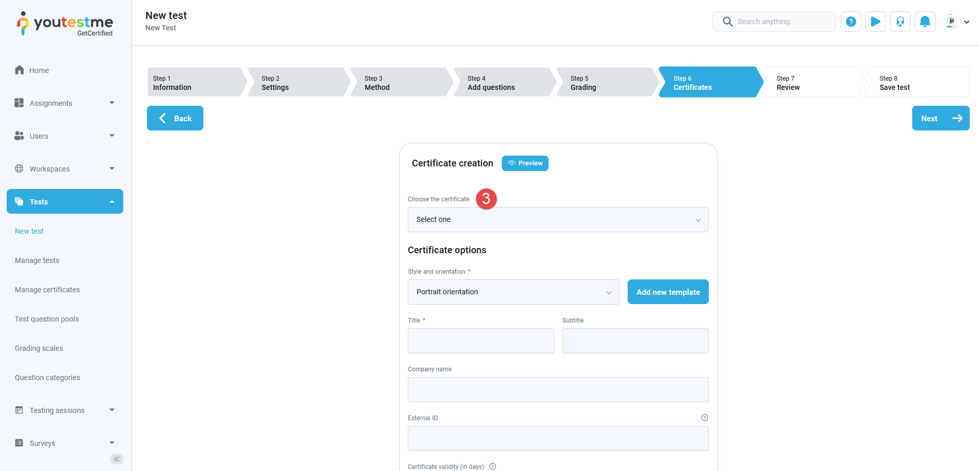 1. First, navigate to the “Certificate” tab in Test Creation Wizard (during the test creation process).