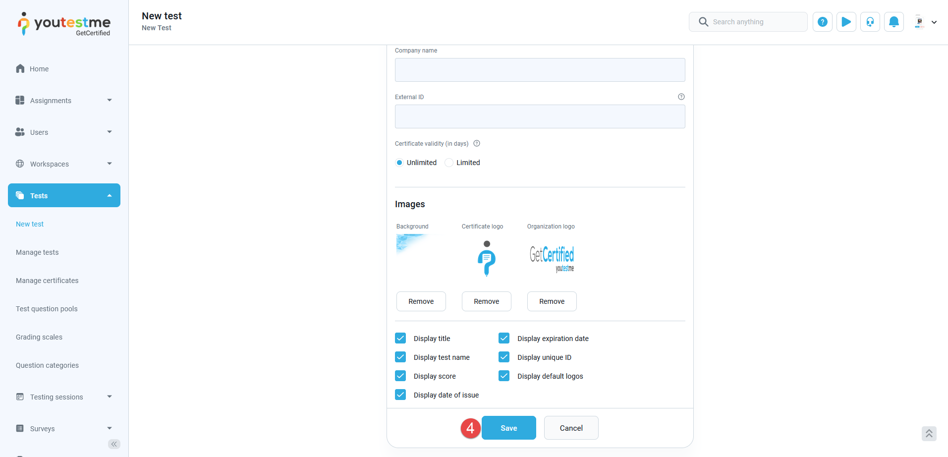 To assign a certificate to a test, follow the steps: