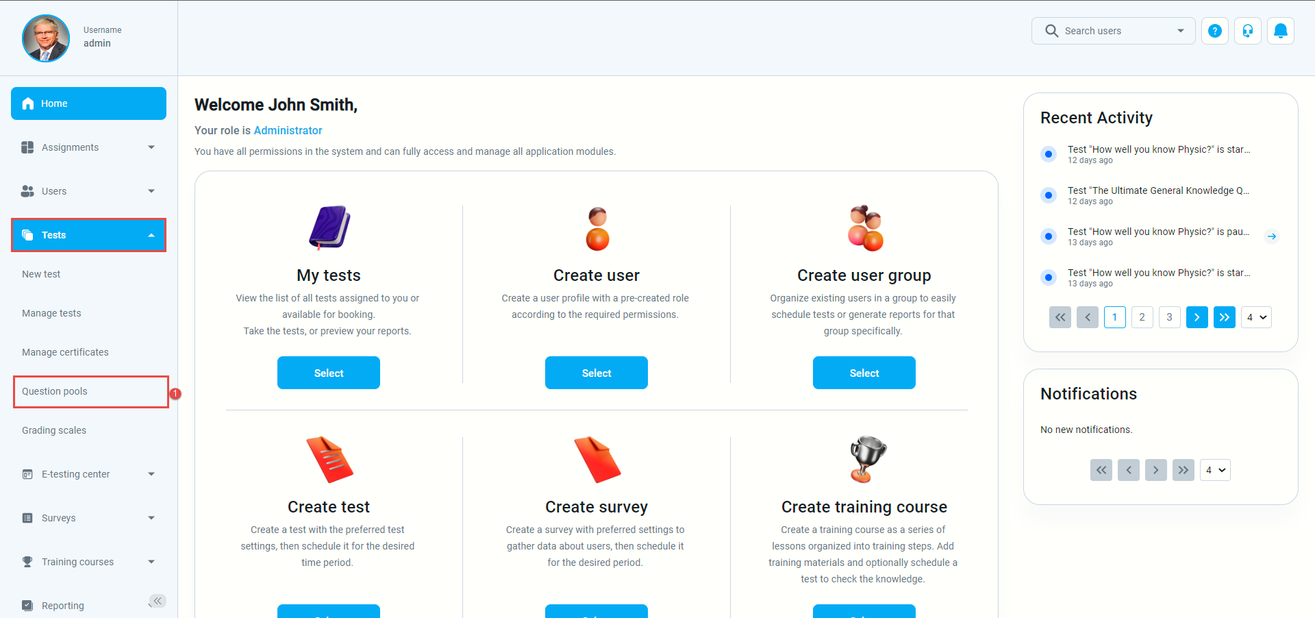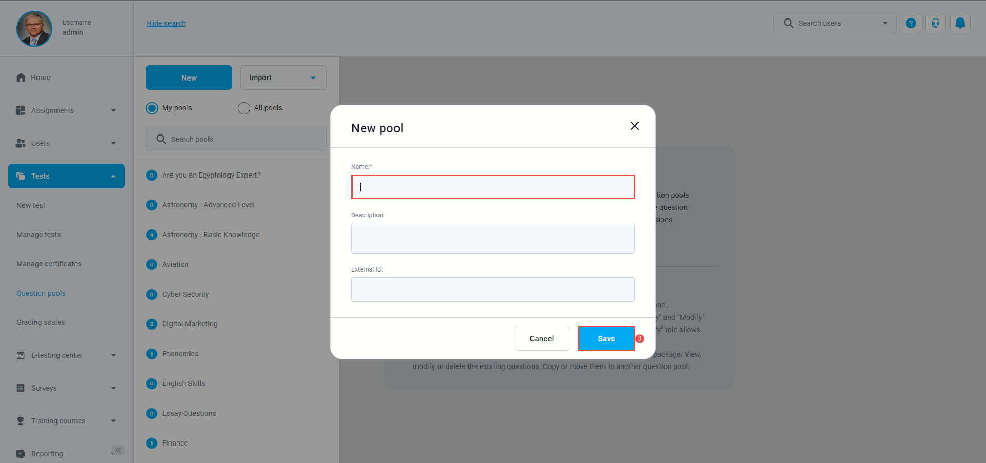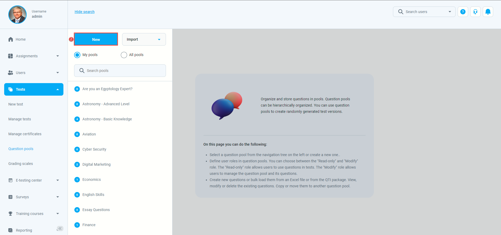 - To access the question pools, hover over the Tests in the main menu, and select Question pools.