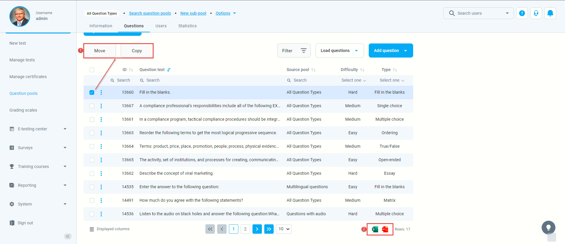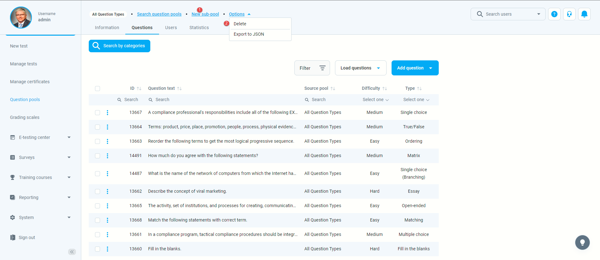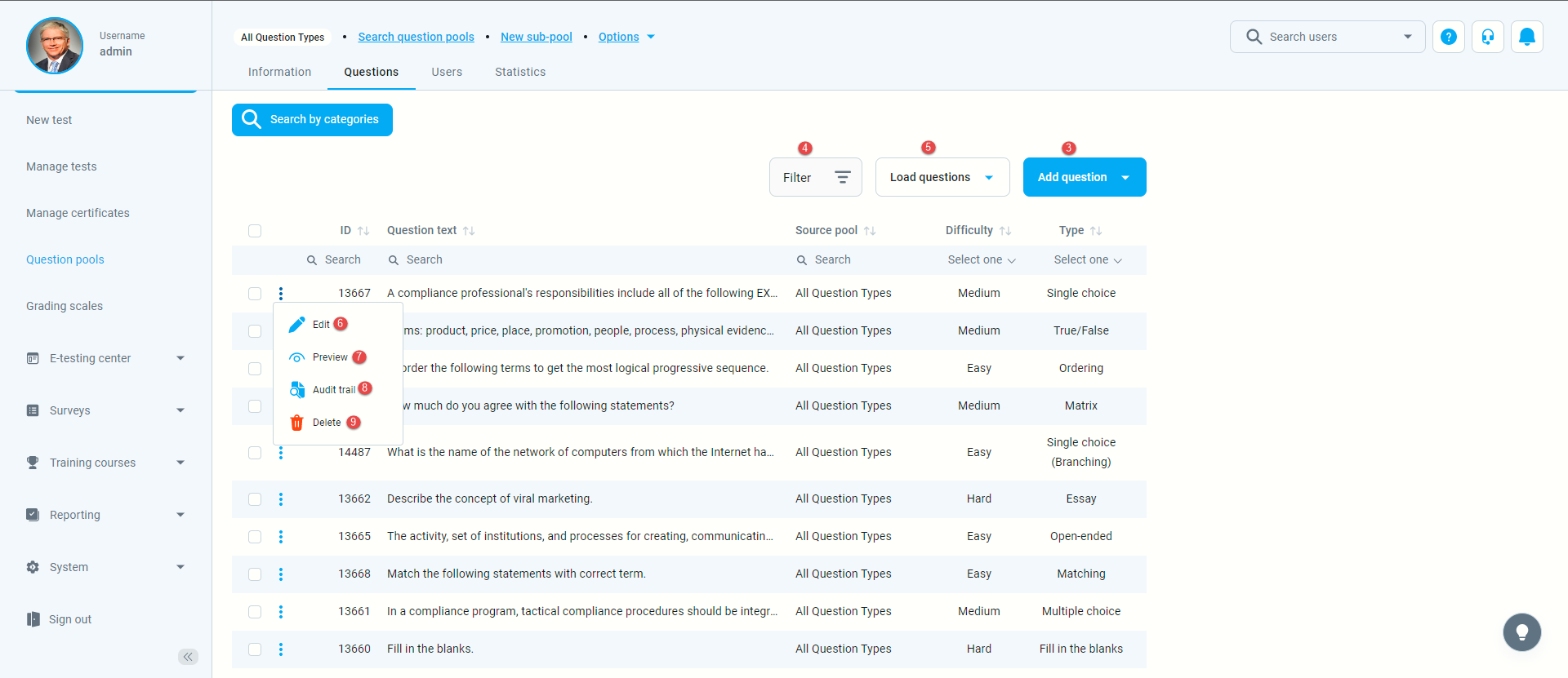 - Load questions using a predefined Excel template – you can prepare questions offline and then load them into the system.