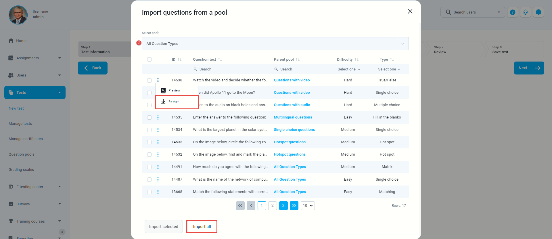 Note: You can reuse questions from the pools an indefinite number of times – you can add the same questions to as many tests as you want. - Select the pool you want to use in the test from the dropdown menu. Assign questions individually by clicking the arrow icon, or assign them all at once by clicking the Import all button.