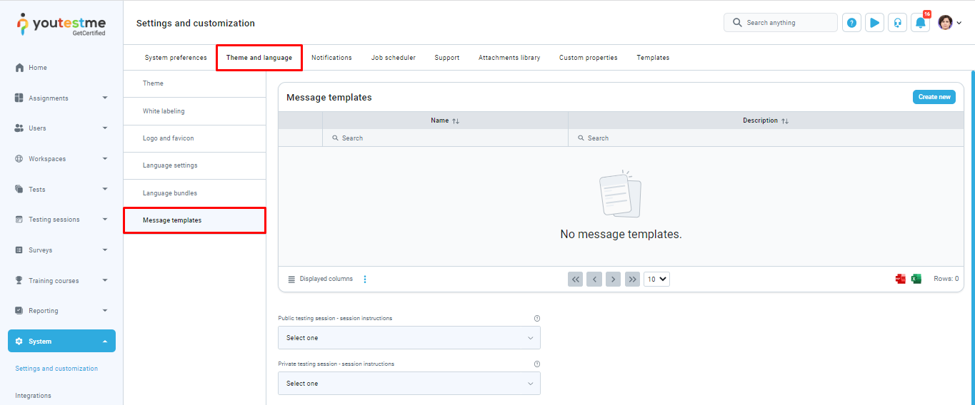 Navigate to the Theme and language tab and select Message templates from the left-side menu.