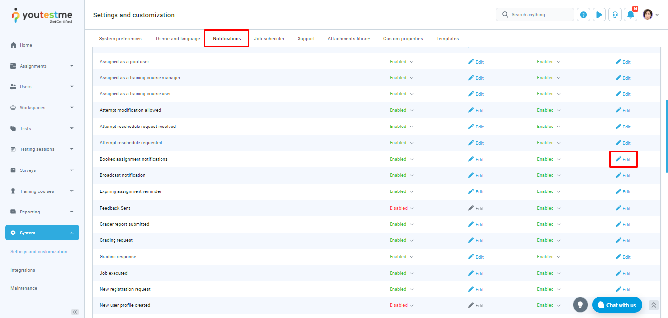 - On the Notifications tab, click Edit on the email notification on which you want to include the session instructions variable.