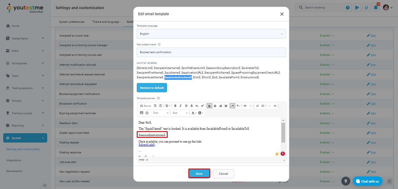 - Add the text that is common for all users to whom the email notification is triggered, and include the Session Instructions variable as shown in the image below.