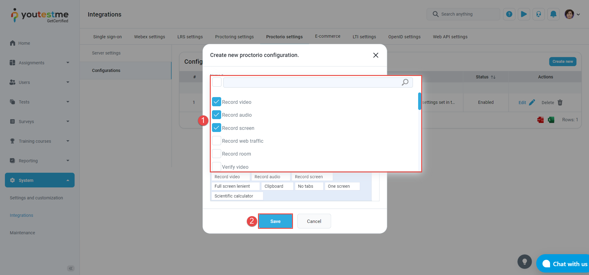 4. Define the “Proctoring configuration” that you want to use for the test.
