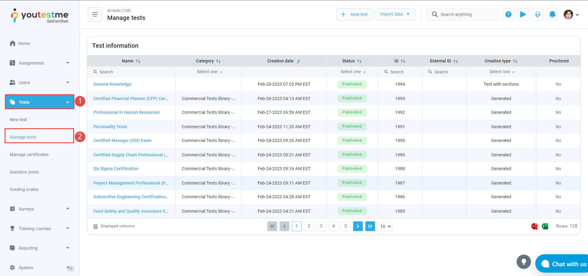 1. Click on the “Tests” tab in the main menu and select “Manage tests” and choose the desired test.