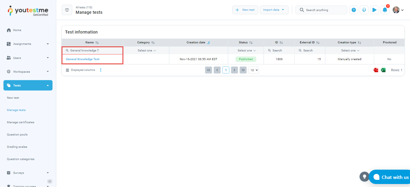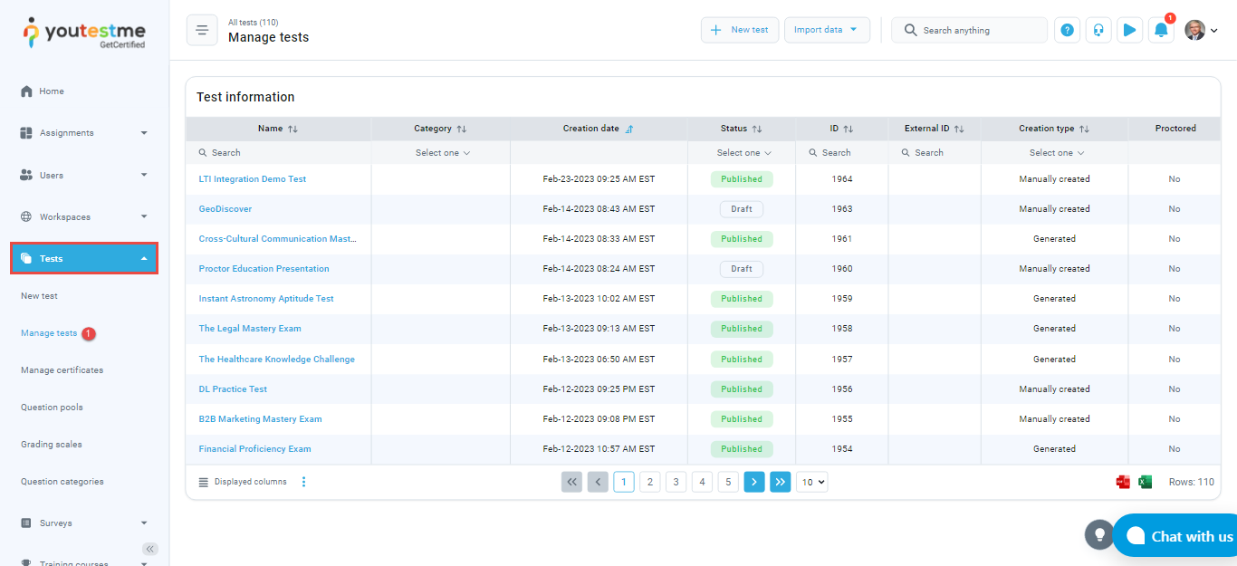 1. Navigate to the “Test” section in the main menu, then choose “Manage tests”.