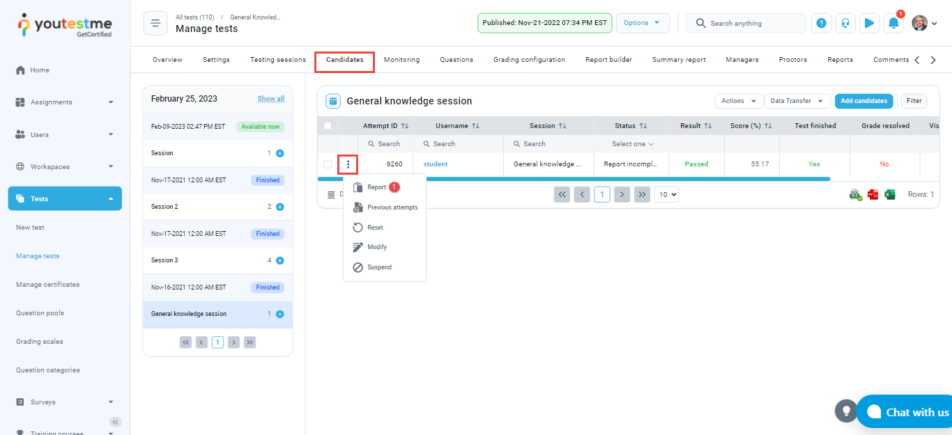 Once the candidate has completed the exam, the administrator can access the candidate’s report by following the instructions below:
