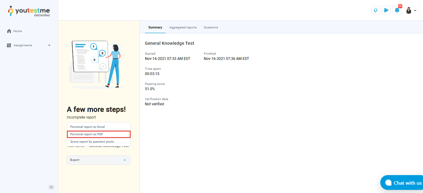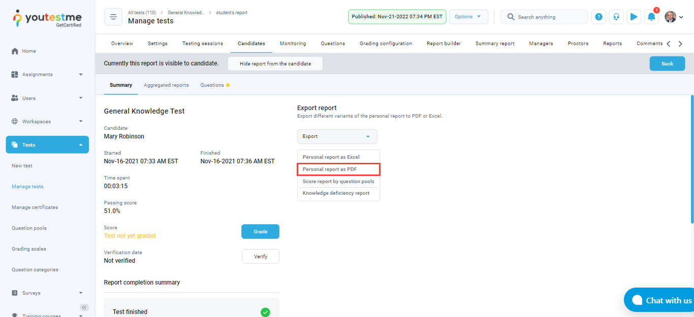 Once the test report is available for the candidate, it can be exported as a PDF. To download the personal report, the candidate should do the following: