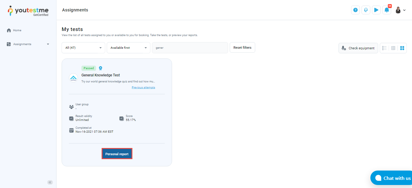 1. Once the desired test on the My assignments page is shown, the candidate should click the “Personal Report” button.