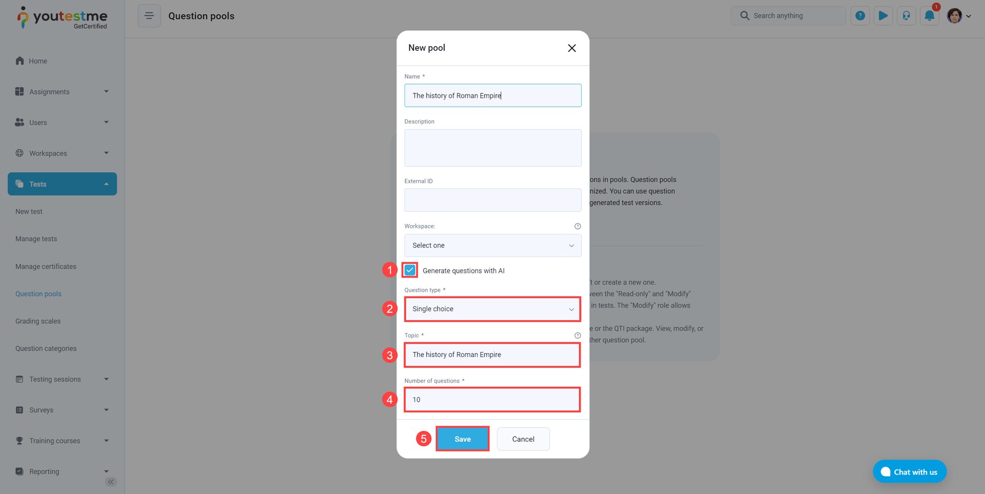 There are two ways of generating questions with AI. The first one is used during the process of question pool creation.