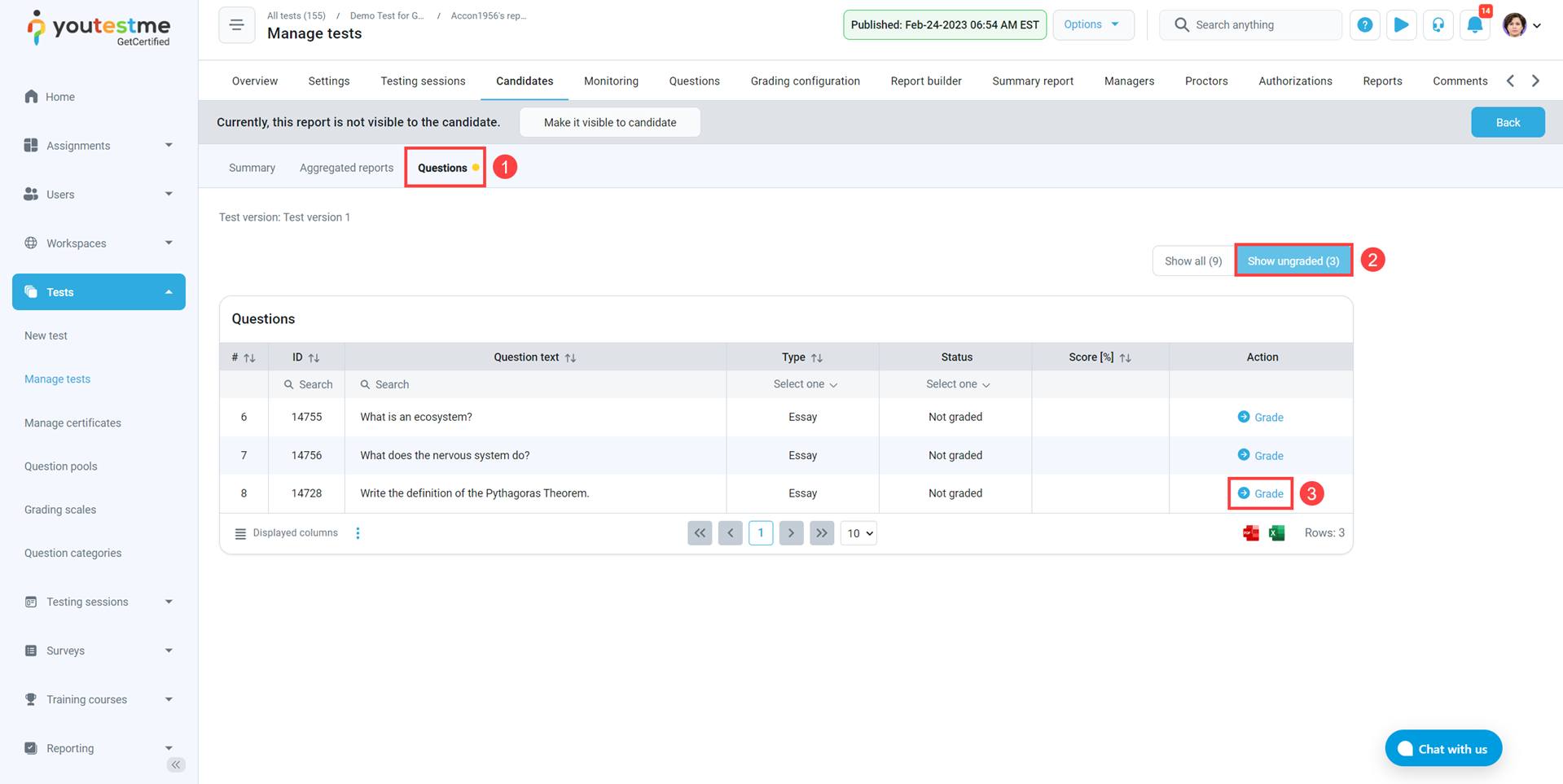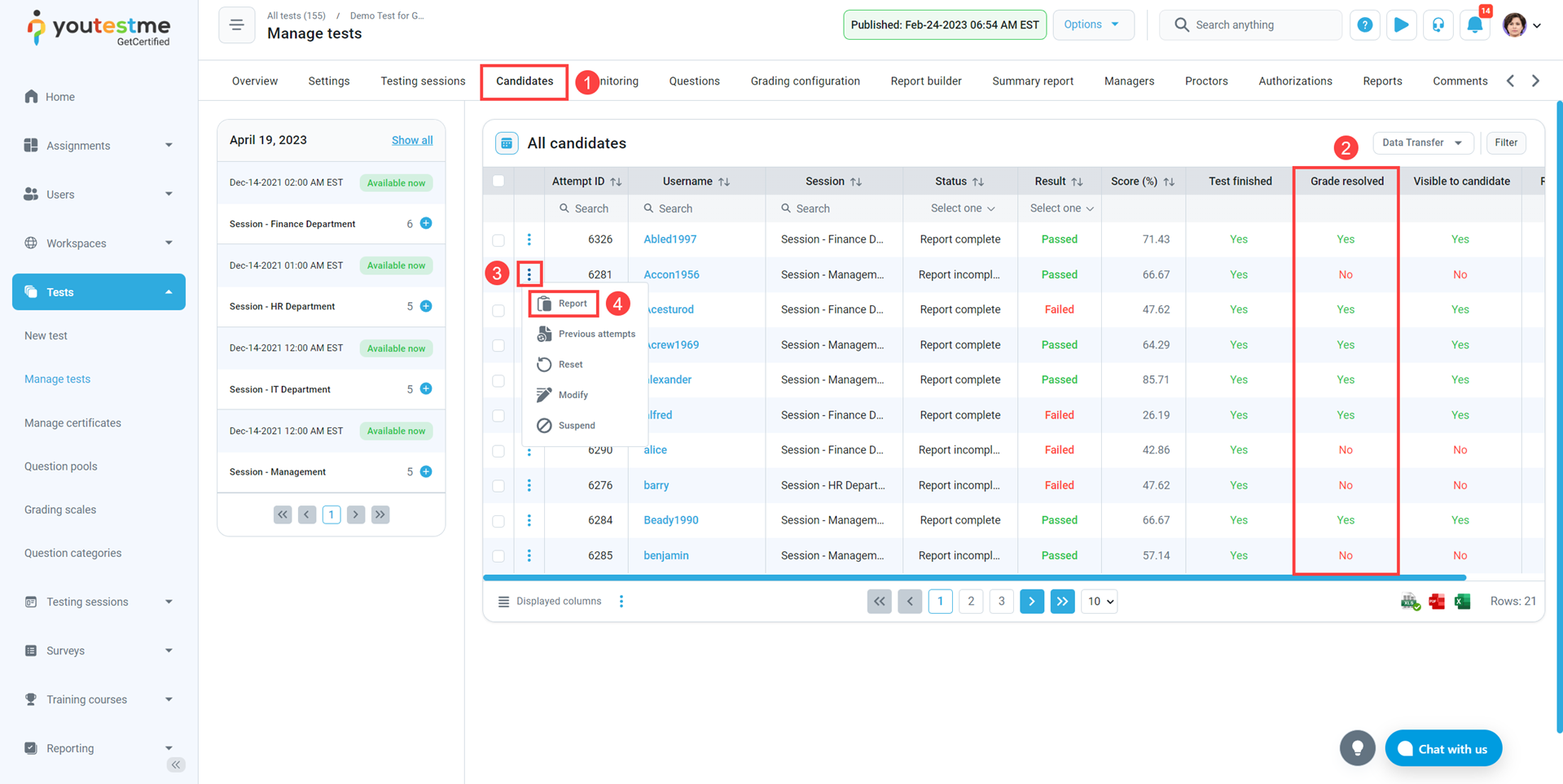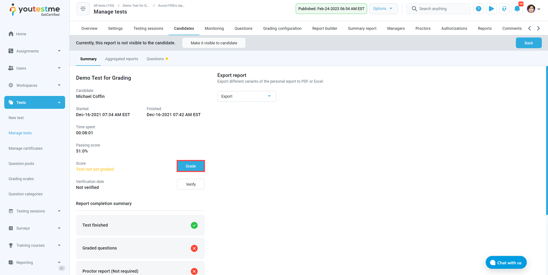 Once a candidate completes the test, a test report will become available for the test manager’s grading and review.