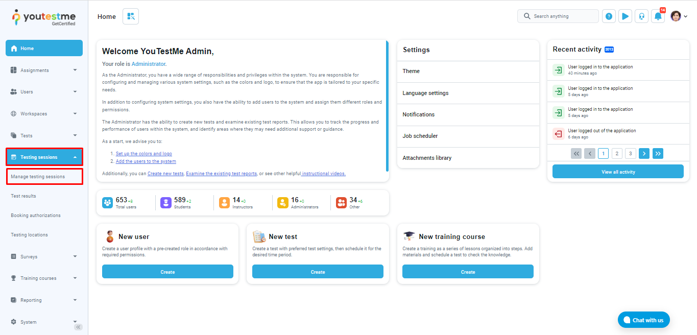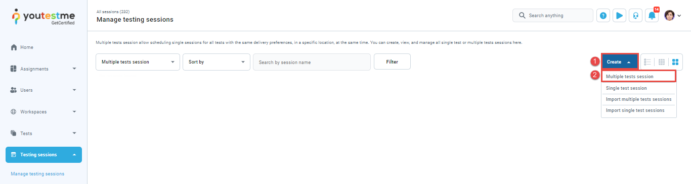 To create a multiple tests session, navigate to the Testing sessions tab in the left-side menu and click on the Manage testing sessions tab.