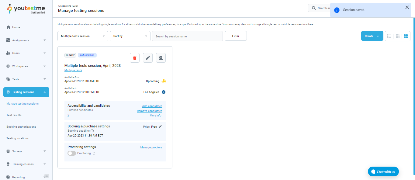 Once the session is created, it will be displayed on the Menage testing sessions dashboard.