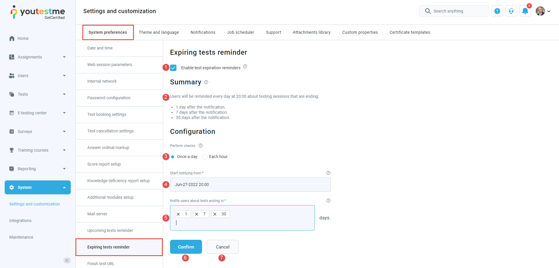 - Enter 1 and 7 in the Notify users about tests ending in the field.