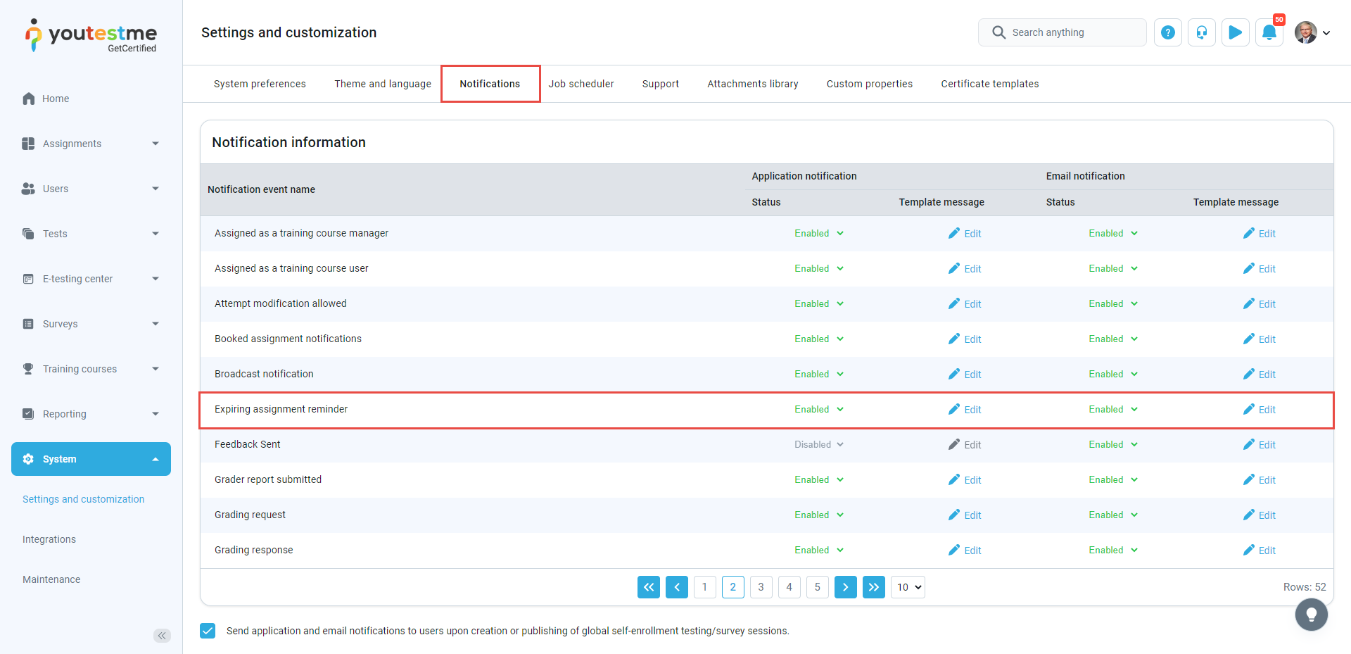 Navigate to the Notifications tab, where you can see a list of notifications, including the Expiring assignment reminder notification.