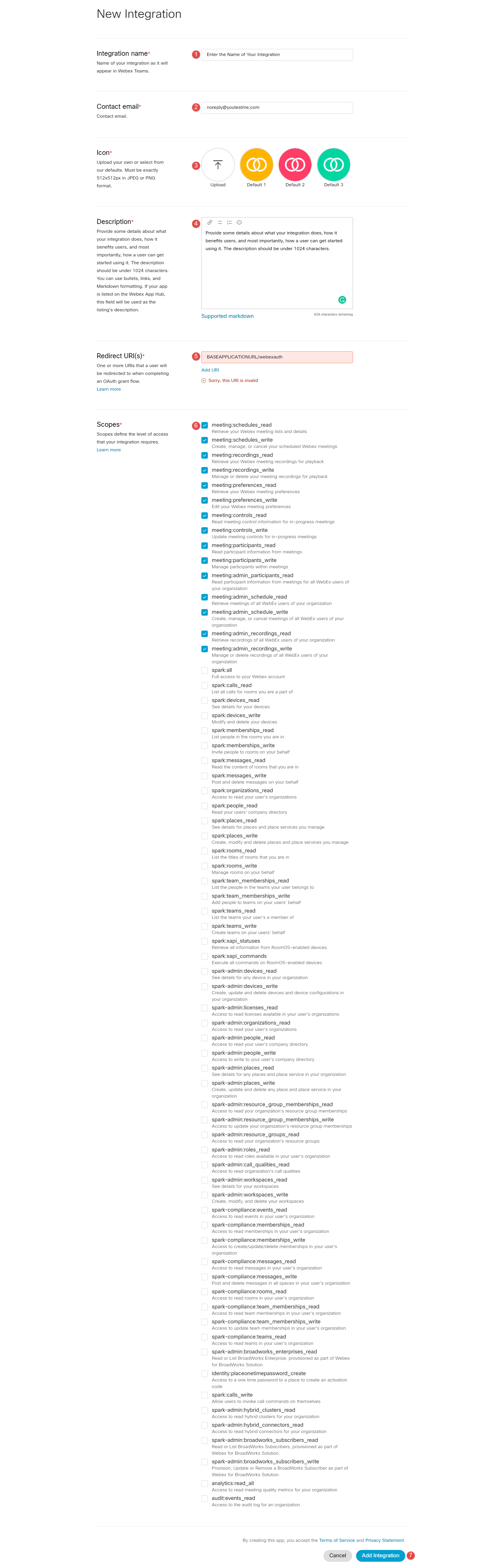 5. Enter Redirect URI, and use the Redirect URI parameter from Webex Settings.