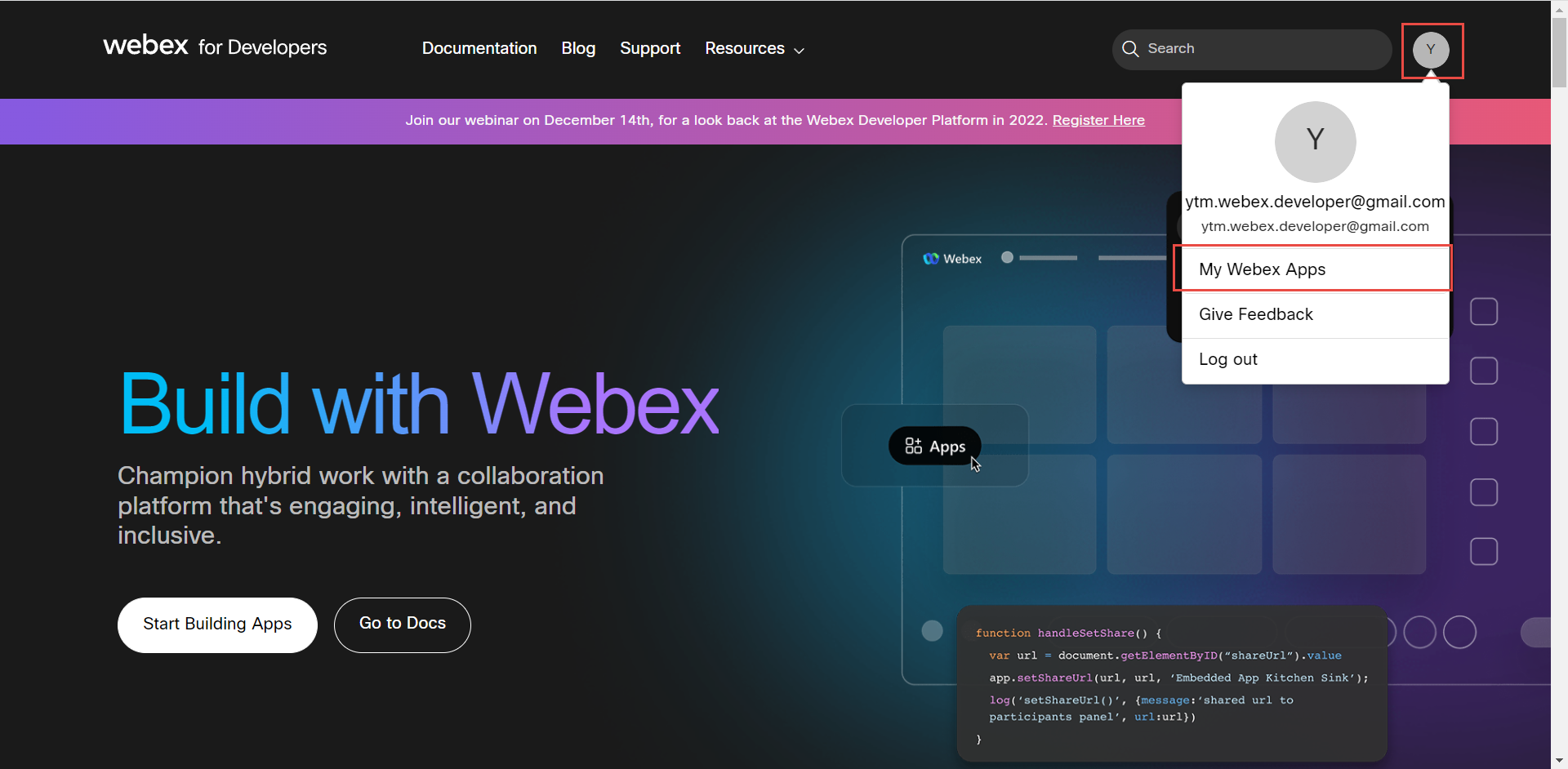 You should log in with the Webex hosting account at https://developer.webex.com/.