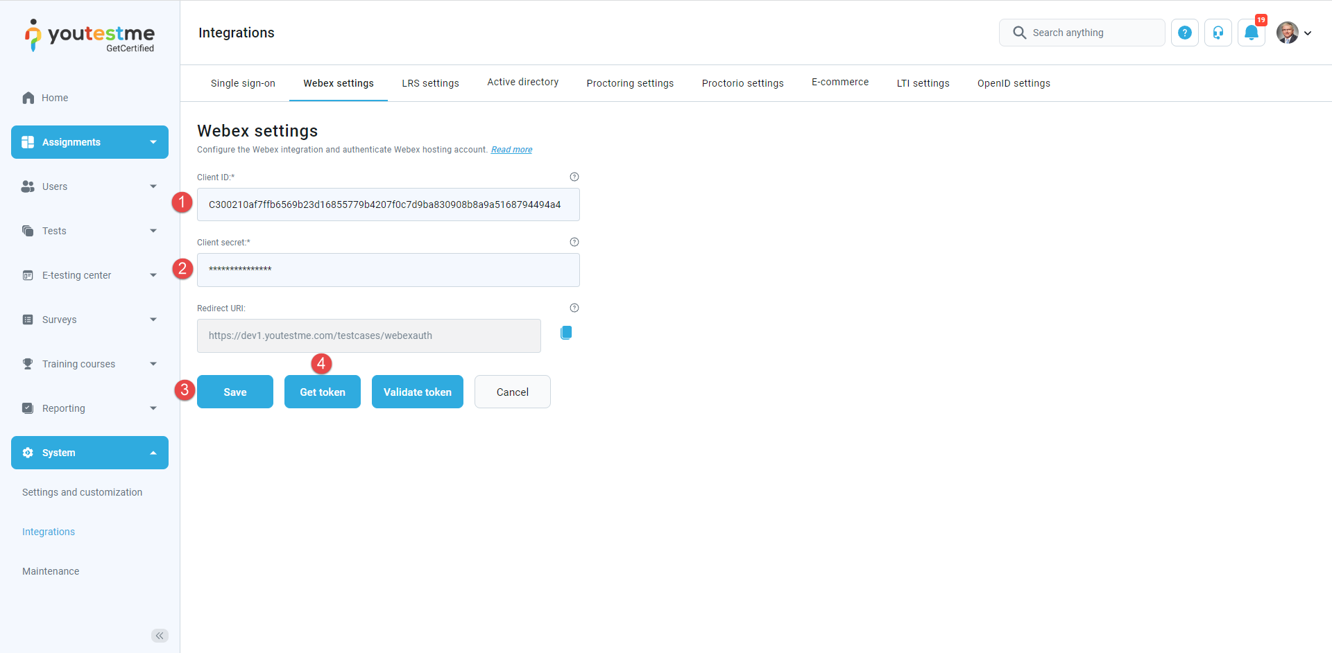 1. Copy the Client ID in the GetCertified Application under the Webex settings tab.