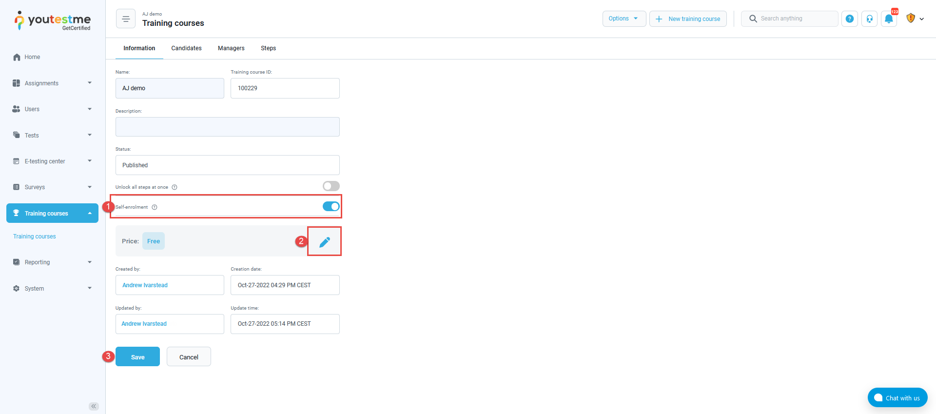 Note: If you add a candidate manually to the training course in the “Candidates” tab, he will not have to purchase the training course. Only candidates not assigned in the “Candidates” tab will have to purchase the training course.