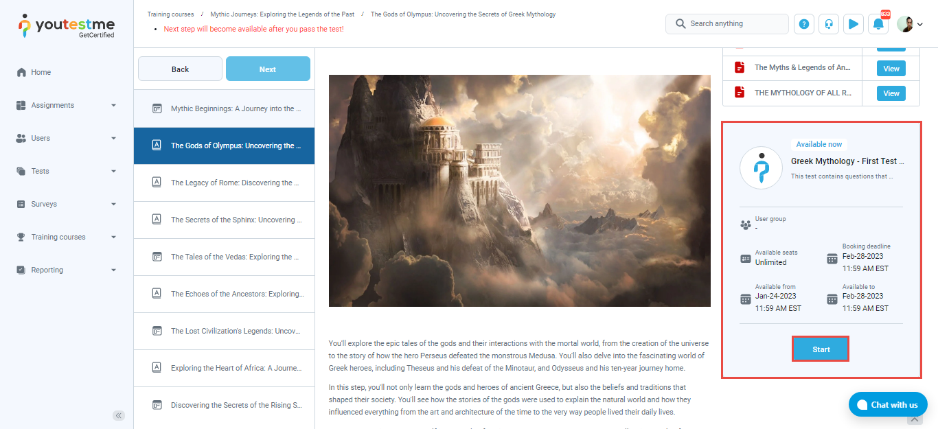 Note: You need to be assigned to the testing session to start taking the test assigned to a training course step.