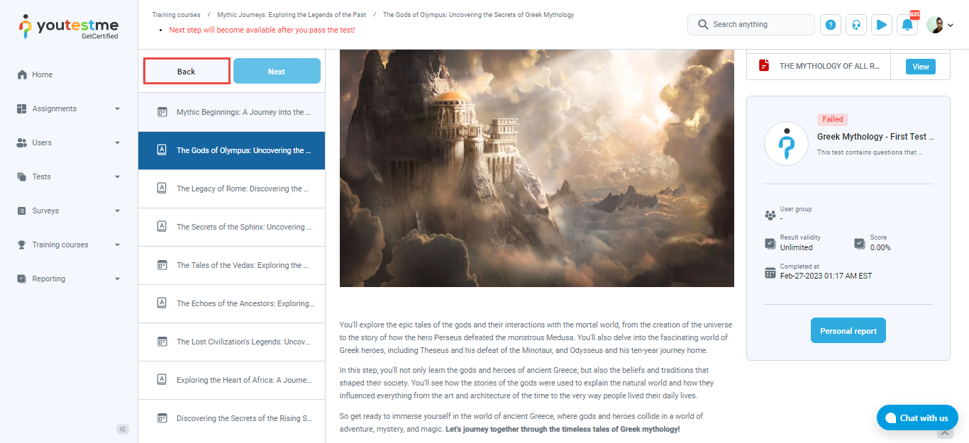 Move to the next training course step and follow the previously explained procedure once again. Please note, that you can go back to the previous training course step anytime. To do so, click the “Back” button.