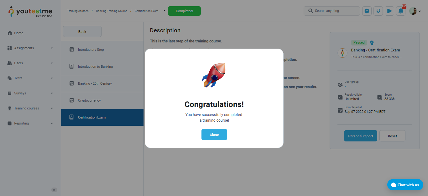 After you pass the test located in this training course step, you can complete the training course. Click the “Complete training course” button, and in the pop-up window, click the “OK” button to finish the course.