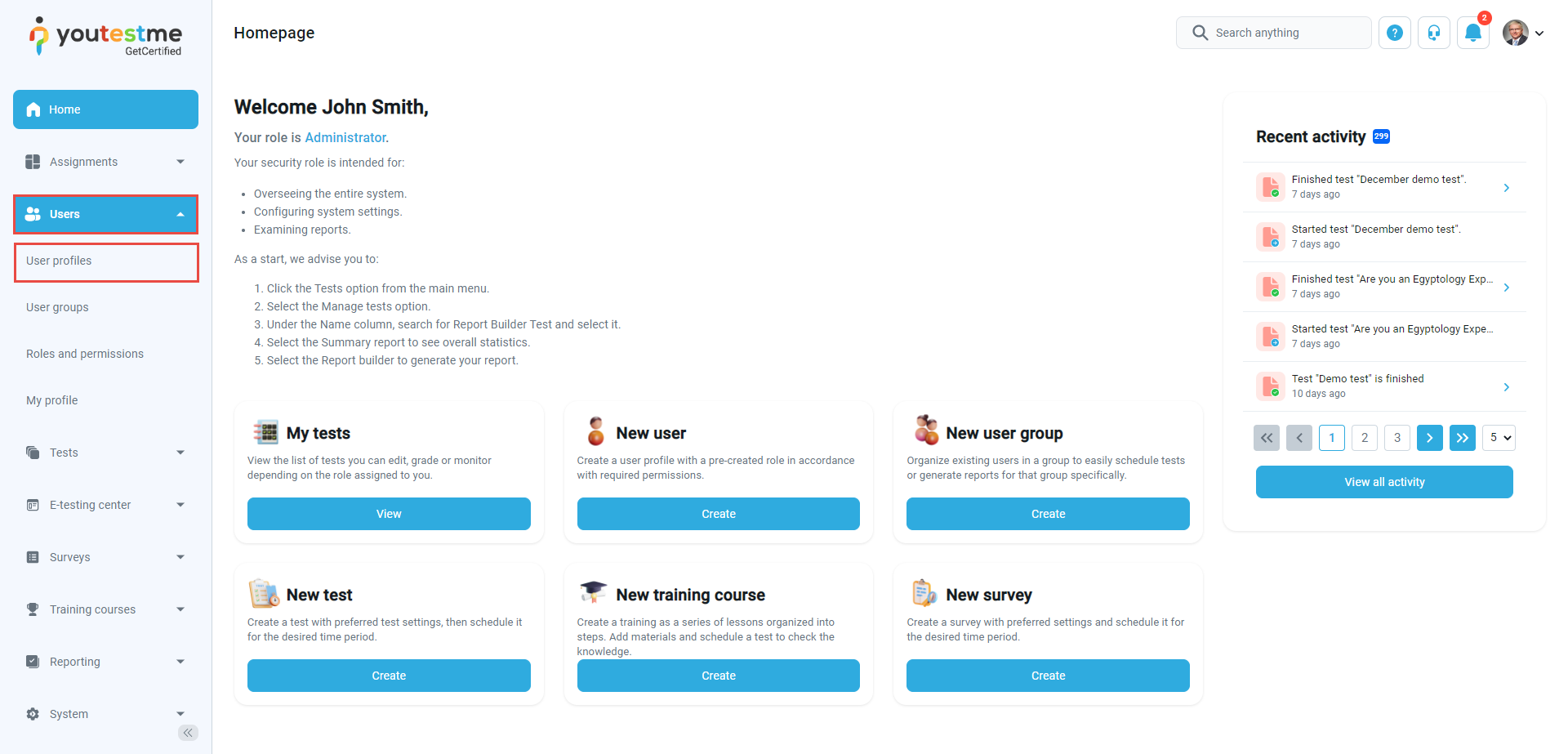 To access the List of all users page, select the Users tab in the left-side menu and select User profiles.