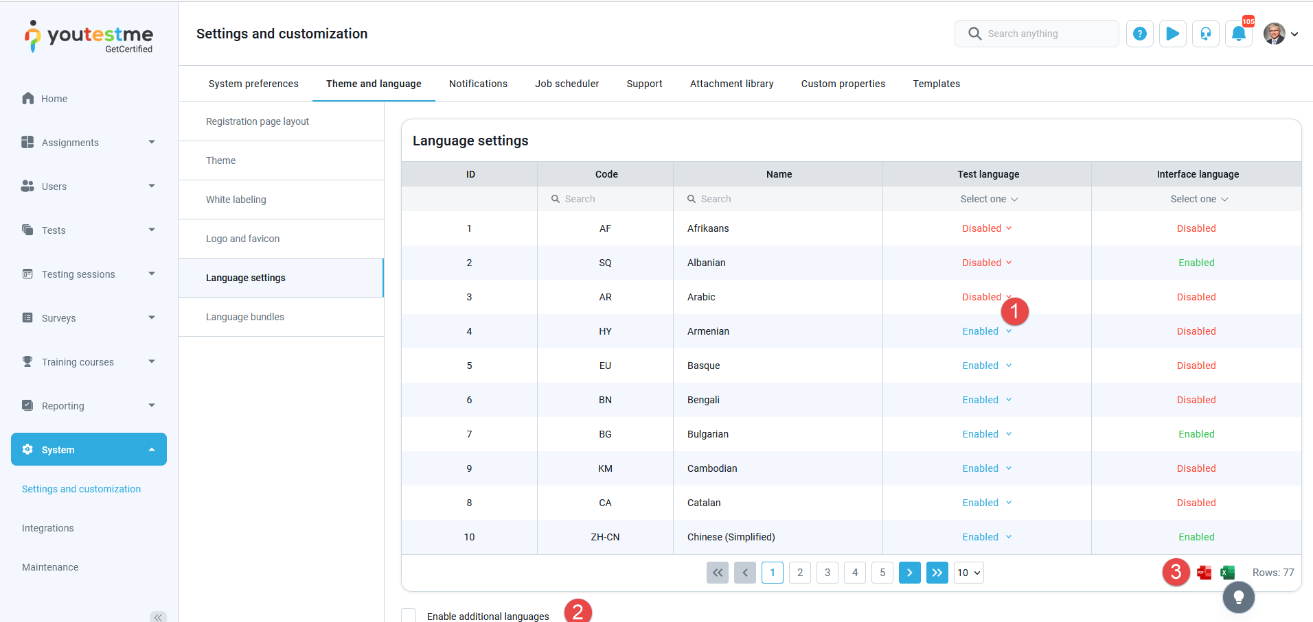 - The “Test language” column can be set to Enabled or Disabled to allow using the selected language in the tests.