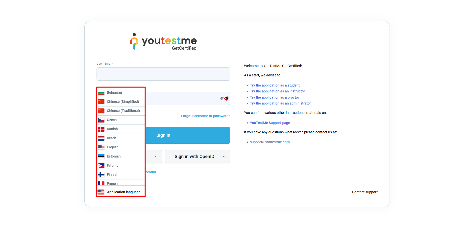 The login page is currently in English by default. The candidate can choose the language on the login page.