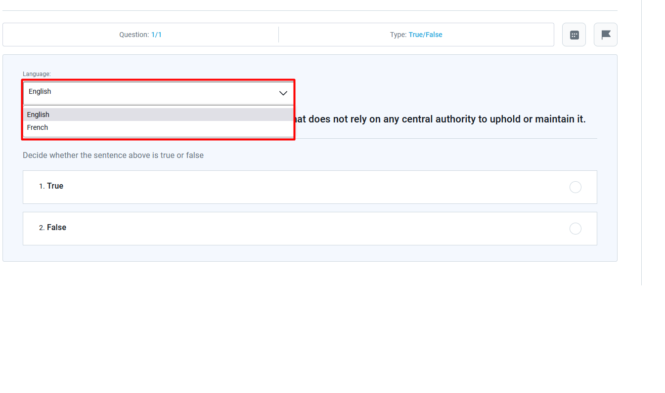 - Language in tests – If the test contains multilingual questions, the user will first see the question in Language predefined on the profile and then select the different Language if preferred. If there is no question translation in this language, the user will see the language set as default when the question was created.