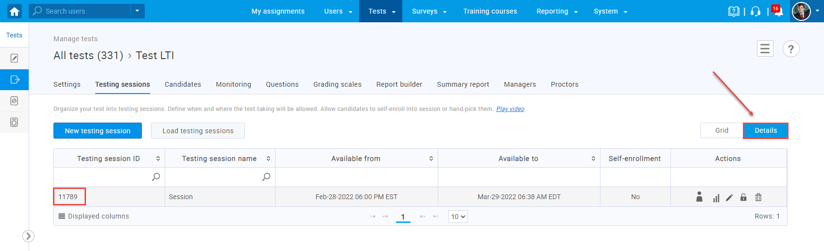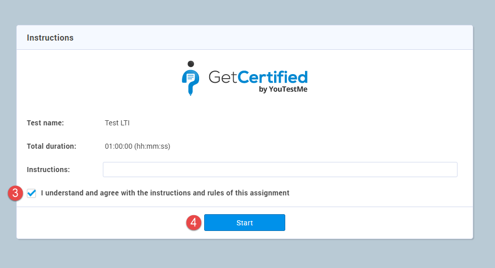 - In the “Custom parameters” field, enter “custom_testing_session_id” and the ID of the testing session in which the candidates need to take the test.The Testing sessions ID in the YouTestMe GetCertified application can be found in the “Details” preview of the “Testing sessions” tab for the desired test.