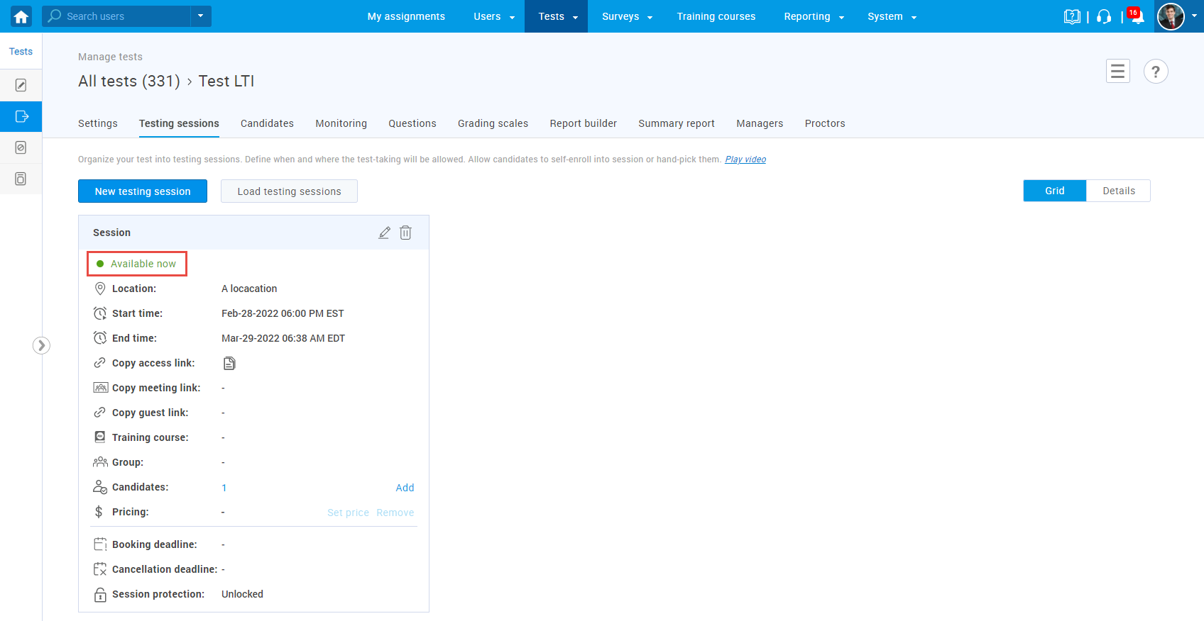 - The assigned testing session must be “Available now” when accessing the test link.