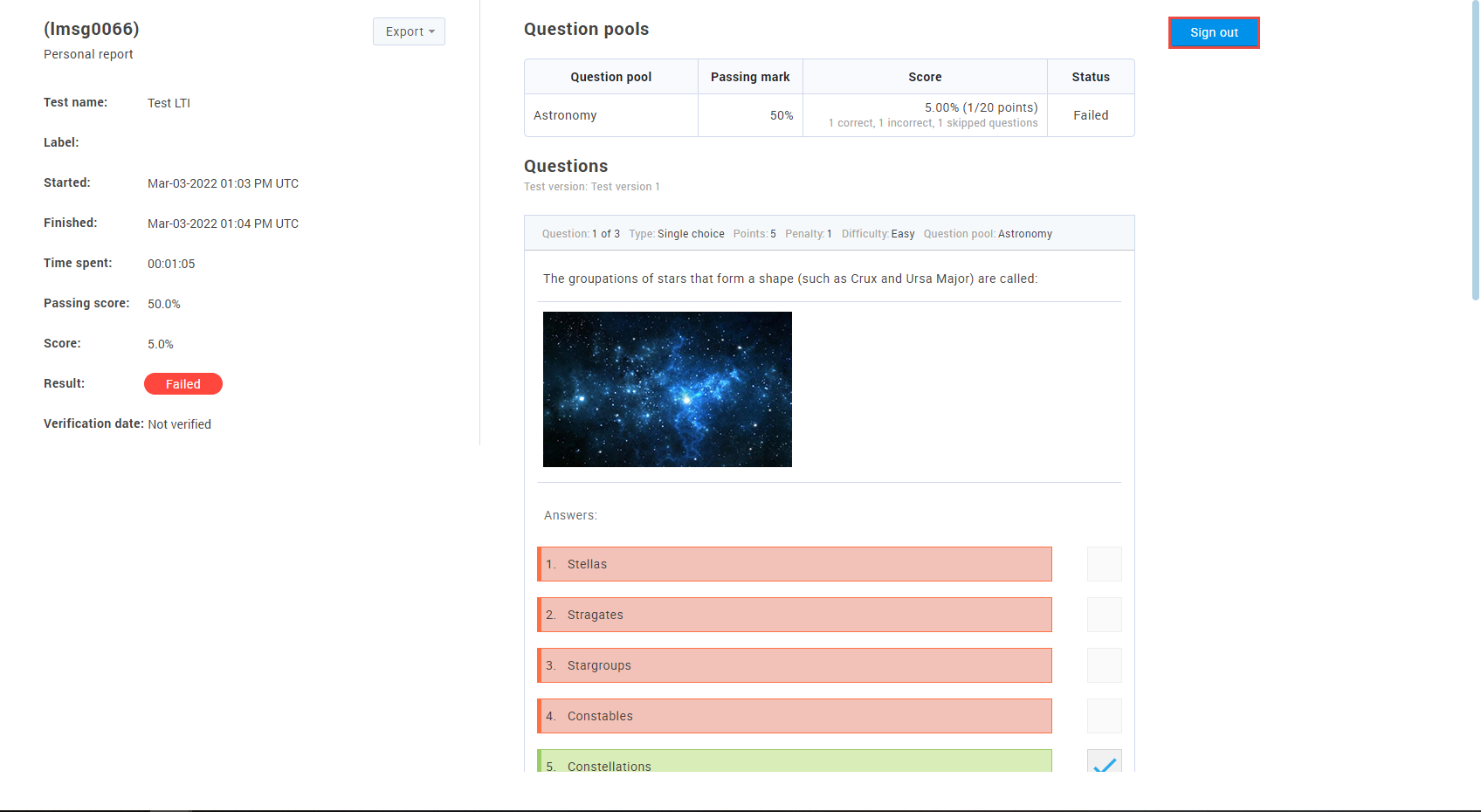 Depending on the test settings, you may be able to preview the test report. To log out from the YouTestMe GetCertified application, click the “Sign out” button.