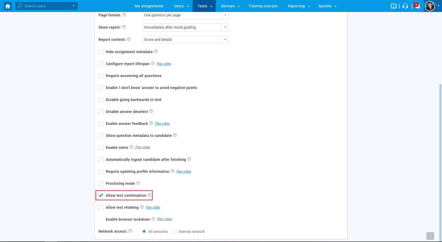 If candidates are allowed to pause the test and continue the test-taking later, you should enable the “Allow test continuation” option while creating a test.